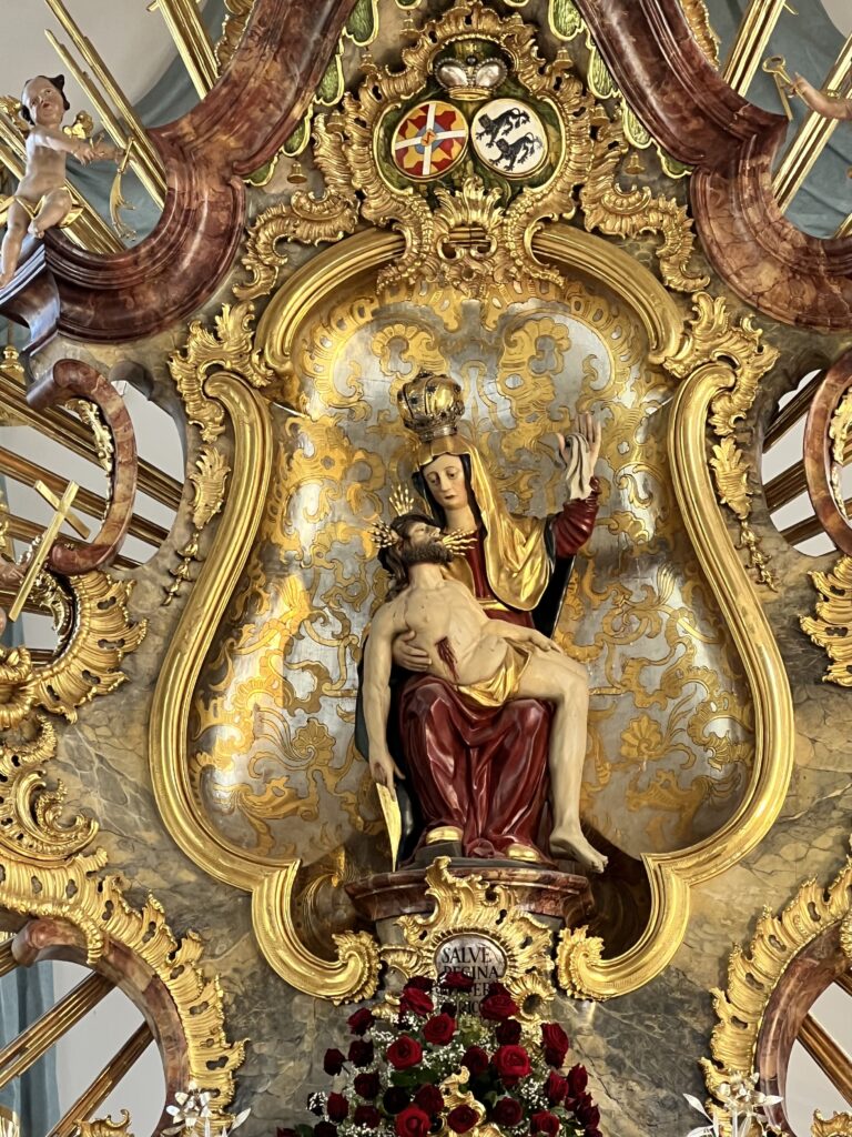 Het centrale gewelf is beschilderd en toont de verering van het vesperbeeld door heiligen. Het is gemaakt in 1755 door Balthasar Riepp (1703-1764).