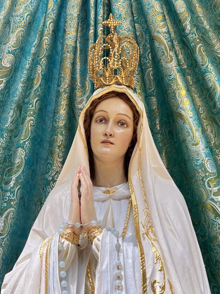 Aan de zijkant bij het hoogaltaar staat een Fatima-beeld, dat in processies rondgaat.