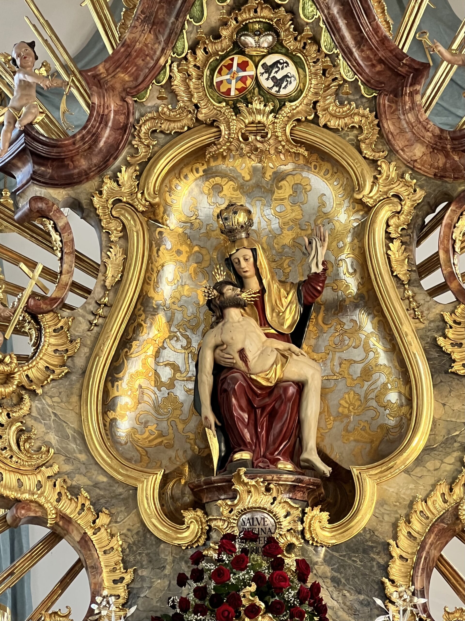 De bedevaartkerk heeft me bij binnenkomst meteen gepakt. Als vanzelf ga ik naar het genadebeeld en kijk langdurig naar de piëta. Wat grijpt deze beeltenis mij aan! Maria is gekroond en vele gouden stralen, putti en bloemen maken de afbeelding nog meer intens te beleven. Het doekje in haar linkerhand is veelzeggend. De zij-altaren tonen ook hier hoe mooi verbeeldingen zijn van Onze-Lieve-Vrouw. Wat een wonderbaarlijk voorval valt me hier toe.