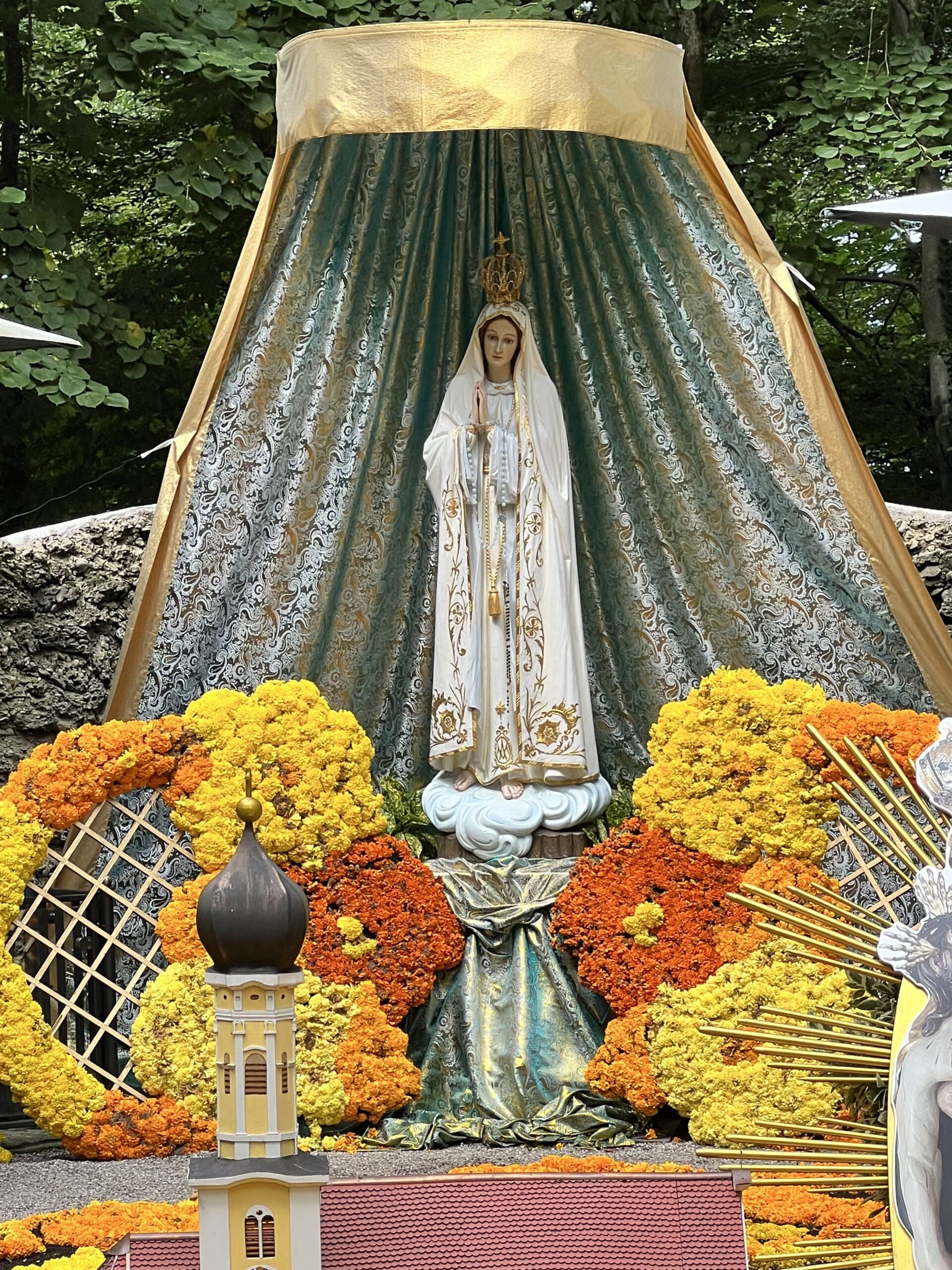 Het kunstwerk met de schitterende bloemen trekt veel aandacht van de pelgrims en ook van mij. De meeste indruk op mij maakt het Fatima-beeld. Wat heeft Maria een innemend gezicht! Wat is Zij beeldig weergegeven! Het voelt als een groot cadeau Haar hier te aanschouwen. Dan raak ik weer in gebed; er passeert zoveel met allerlei gedachten.