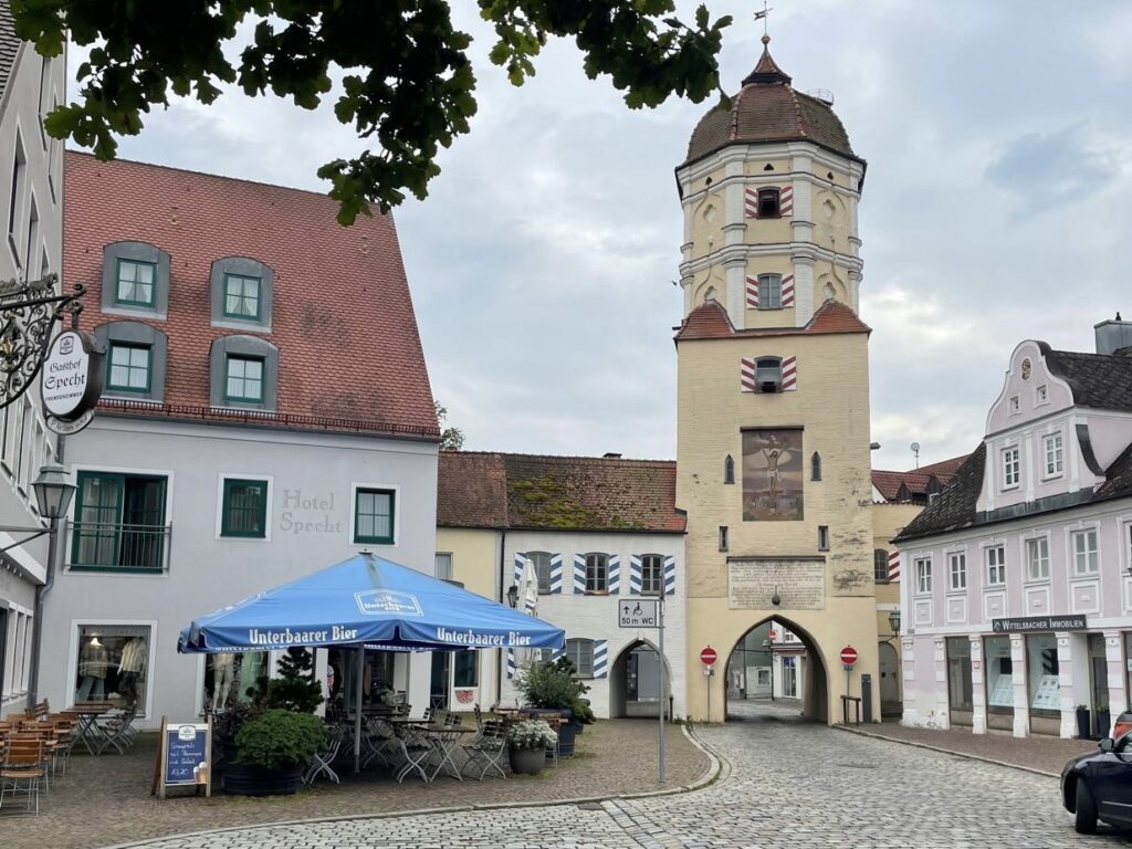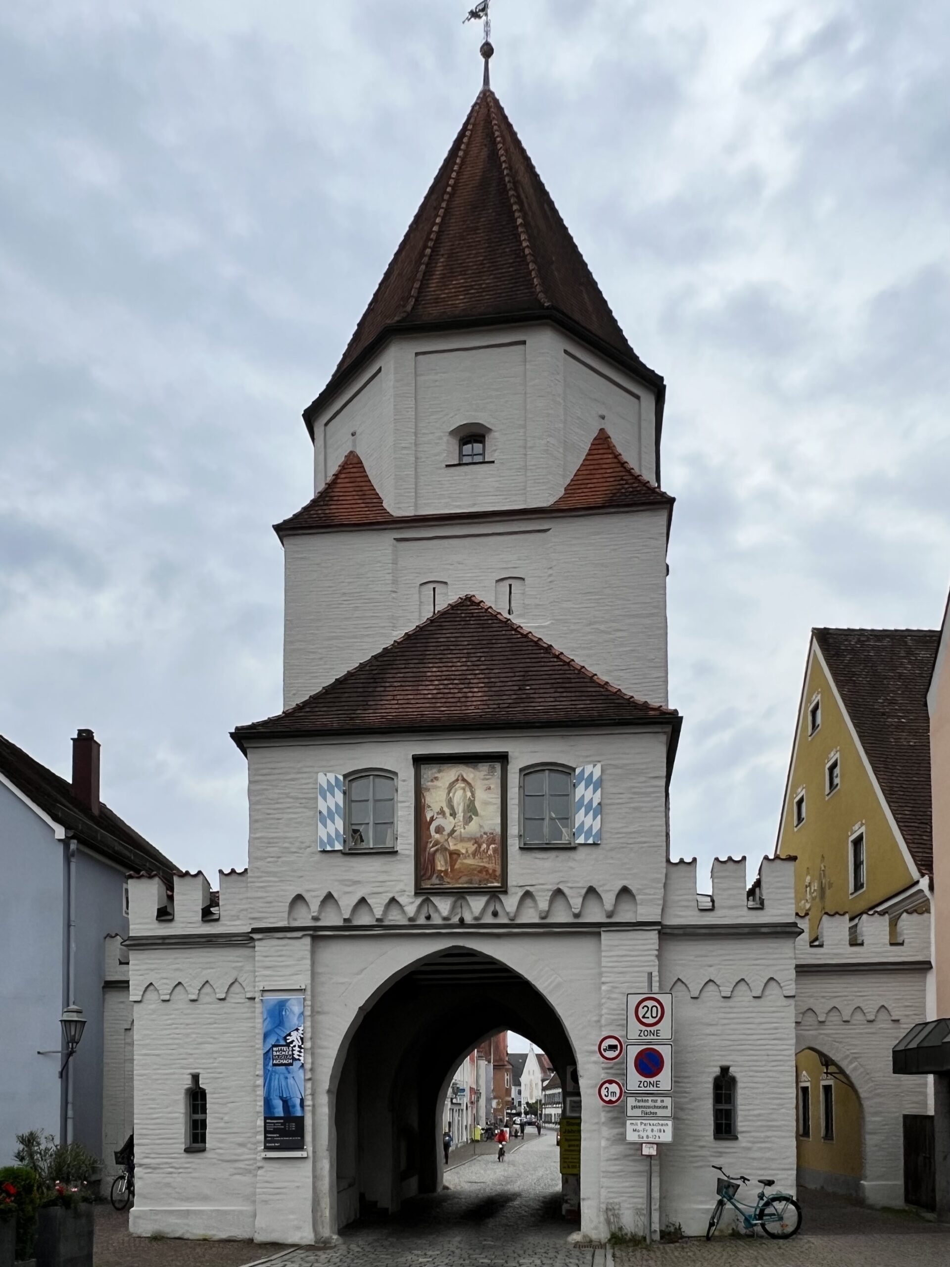 Op een oude stadspoort van Aichach is een schildering van Maria en een ridder, die een blad vasthoudt met de tekst: Verlos ons van alle plagen. In de stad zijn ook schilderingen tegen gevels te bekijken.