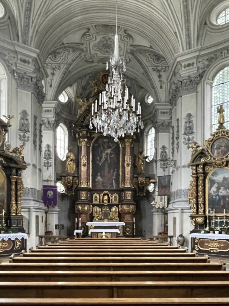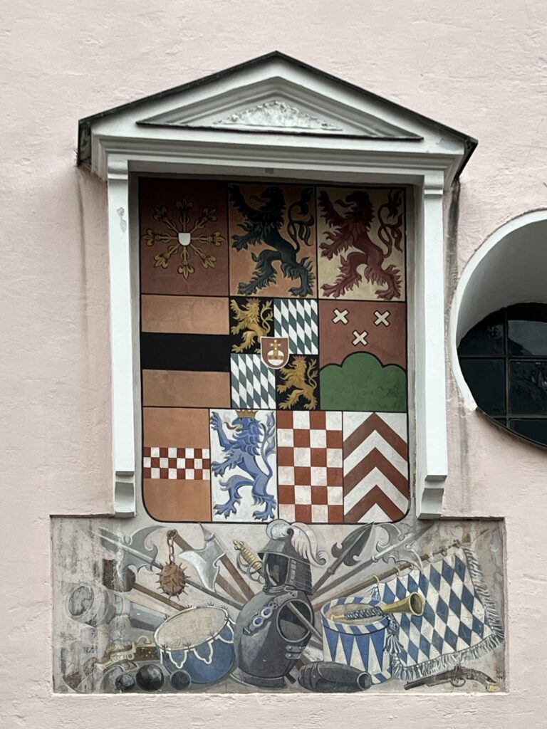 Tegen de façade hangt een schildering met wapens van bezittingen van het Huis van Wittelsbach in 1777, waaronder het wapen van het Nederlandse Bergen op Zoom, de stad waar ik ben geboren en woon. In de kerk is ook een piëta te zien. Verder afbeeldingen van Maria met onder andere het tafereel dat Zij staat onder het kruis en een groot hart toont. Boven het retabel is een glaswerk van Maria met Kind. Hierbij staat dat Maria de patroonheilige van Beieren is en dat Zij beschermt. In de kerk is een grote plafondschildering met Maria, een engel en de Heilige Geest. Op het middelst altaar is een houten beeldengroep met de kroning van Maria door de Drievuldigheid.