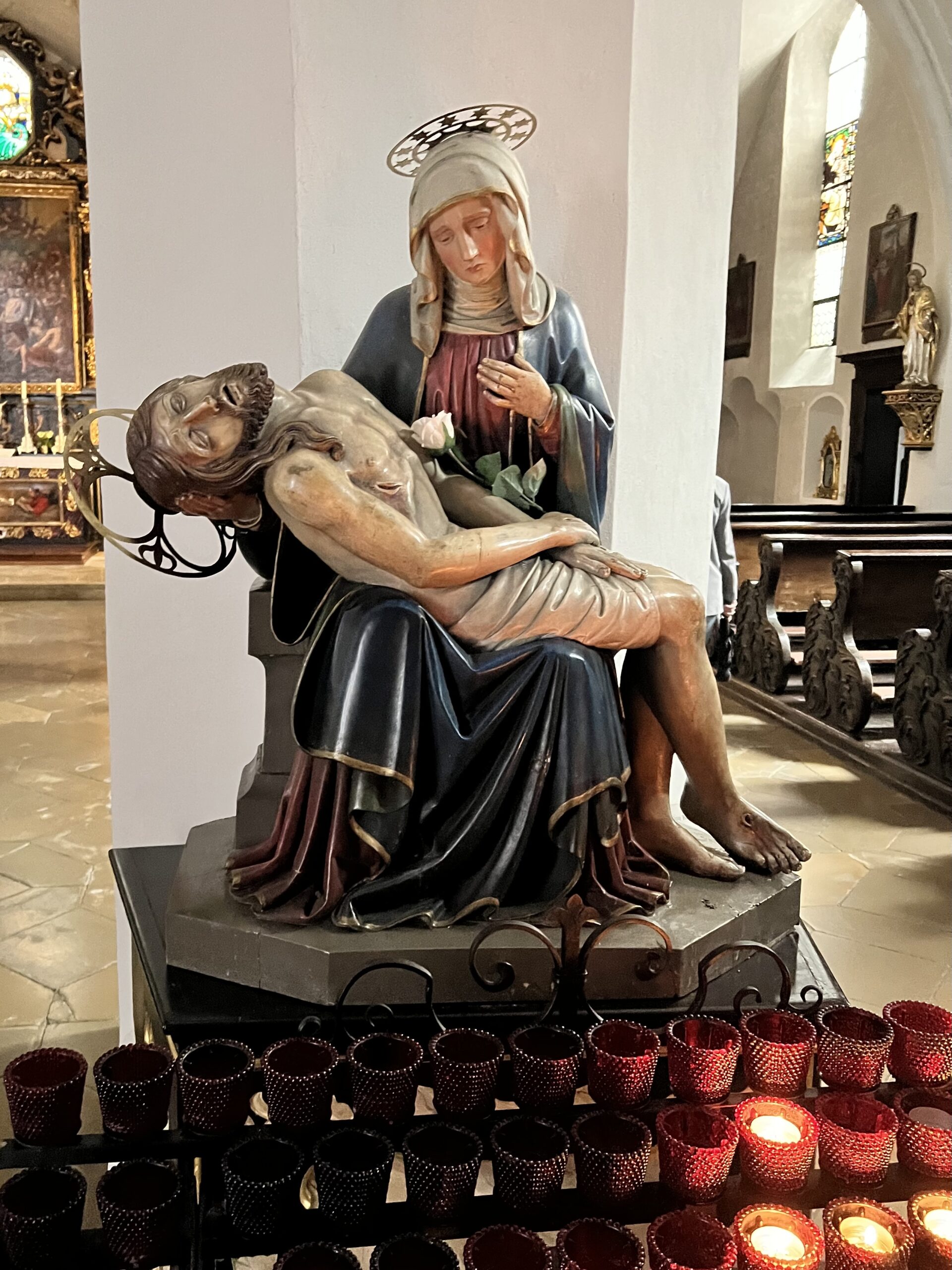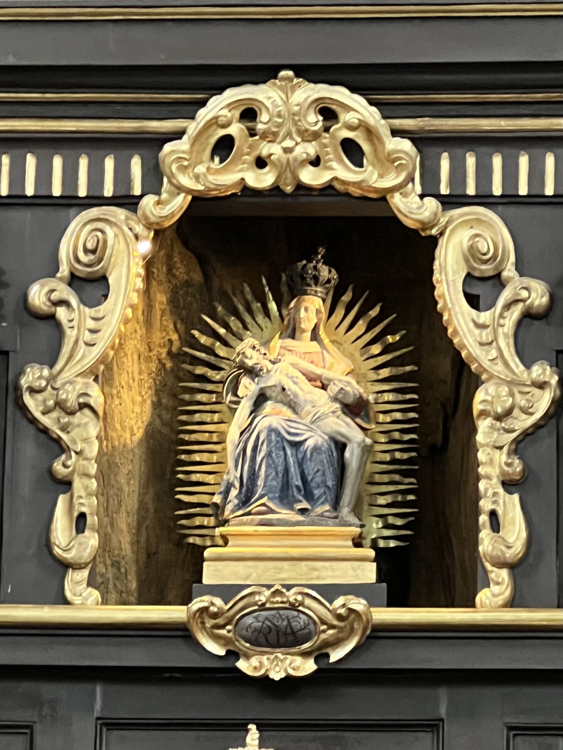 Bij het hoogaltaar zie ik het genadebeeld dat een en al verdriet toont. Dit genadebeeld is een vesperbeeltenis met de bedroefde Maria en haar dode Zoon. Hierboven is de kruisafname van Jezus weergegeven.