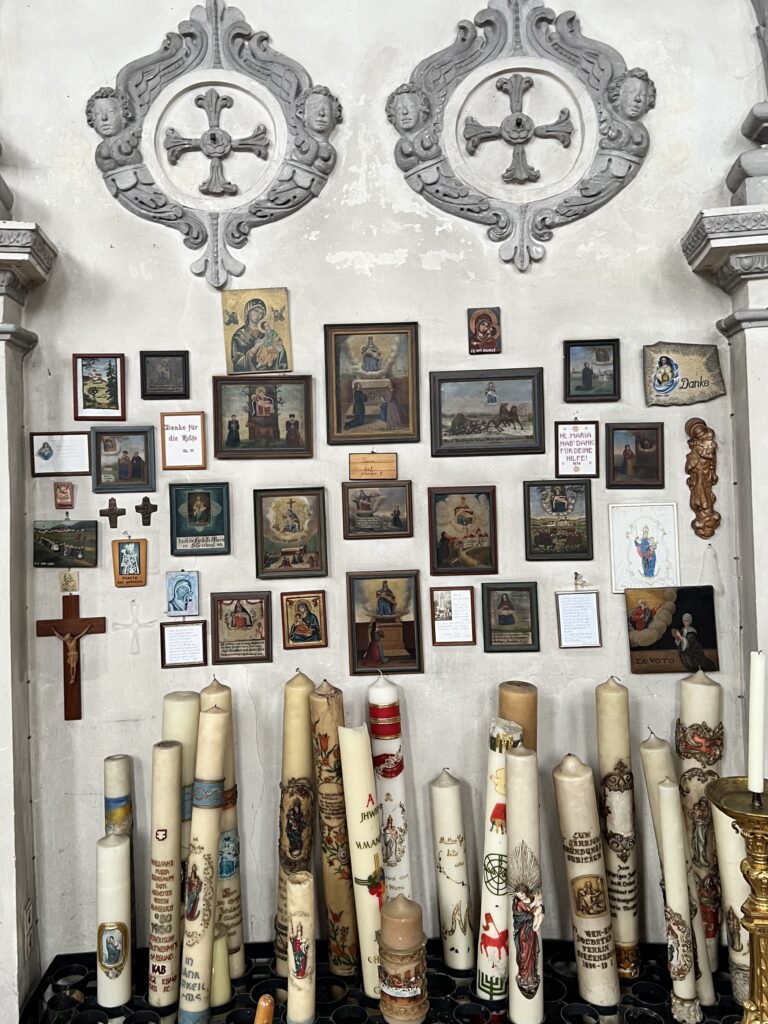 In de bedevaartkerk zijn grote, oude kaarsen uitgestald en daarbij is een grote hoeveelheid ex voto’s te zien. Wat zijn deze tegels en schilderwerken blijken van grote dankbaarheid aan Onze-Lieve-Vrouw.