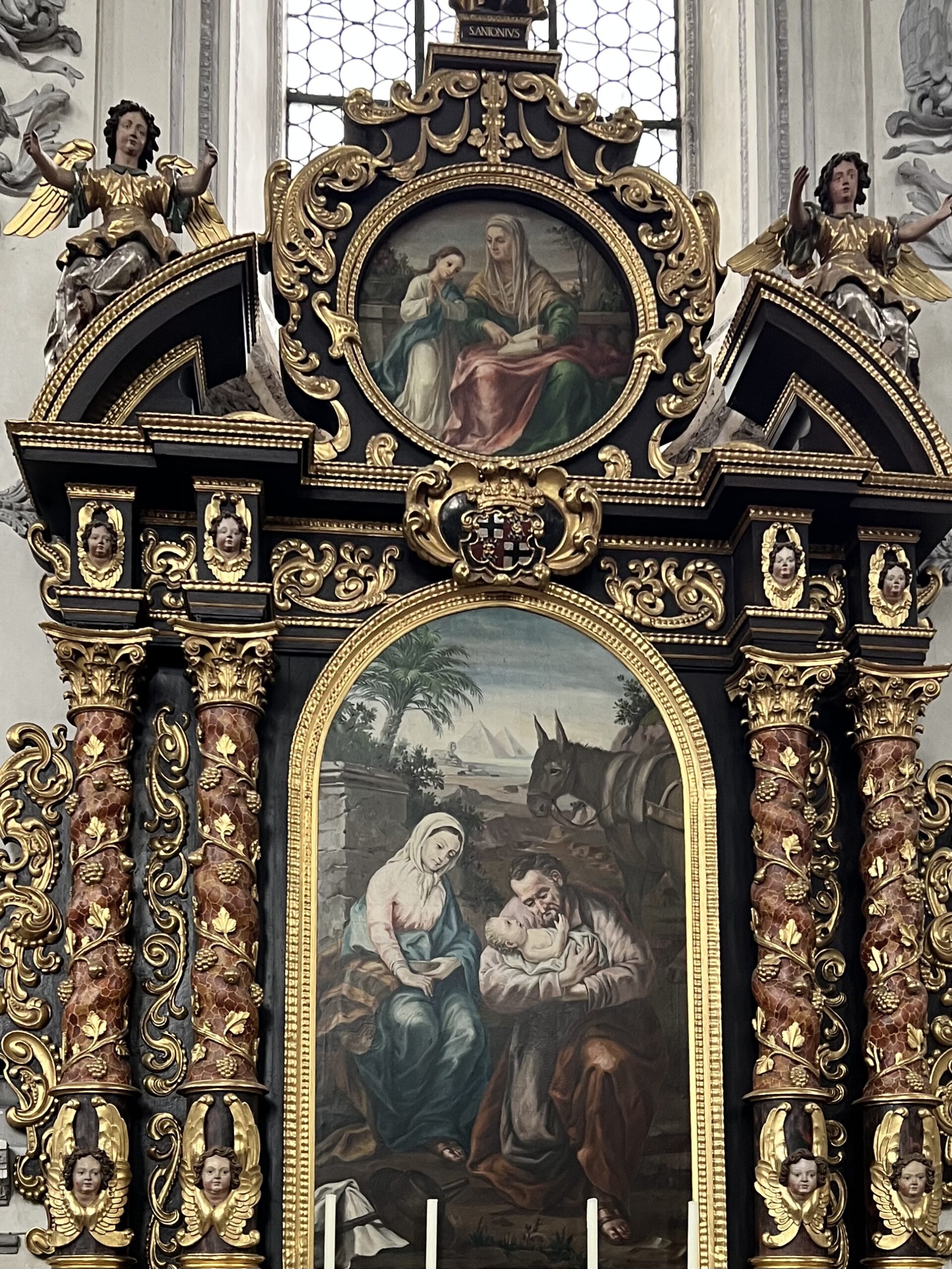 Een mooi retabel vind ik de schildering van Maria, Jozef en de kleine Jezus, met hierboven een rond schilderij van moeder Anna en haar dochter Maria. Jozef houdt de kleine vast, Maria kijkt toe en een dergelijk tafereel is niet zo vaak afgebeeld.