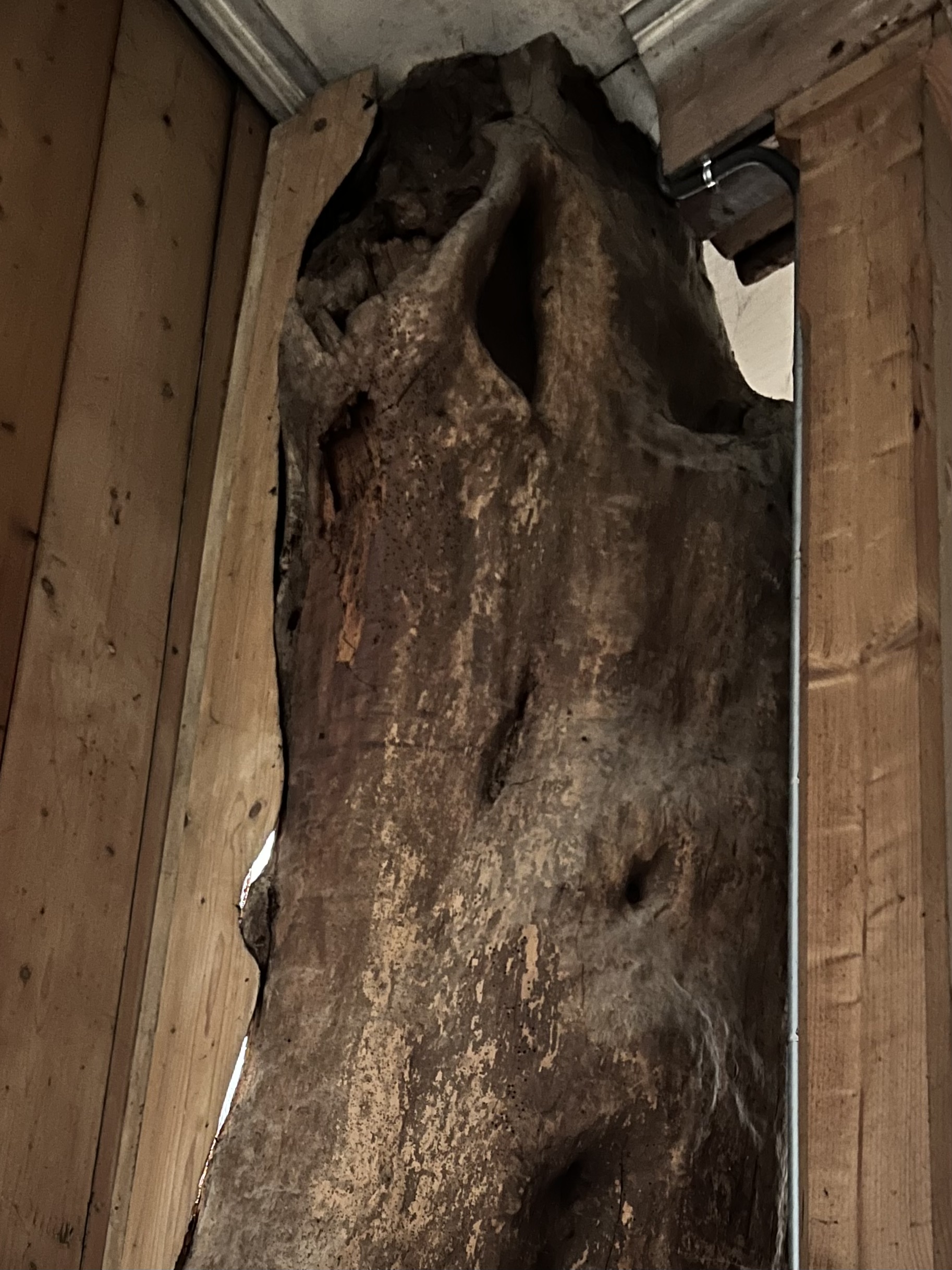Achter het hoogaltaar staat een deel van de oorspronkelijke perenboom.