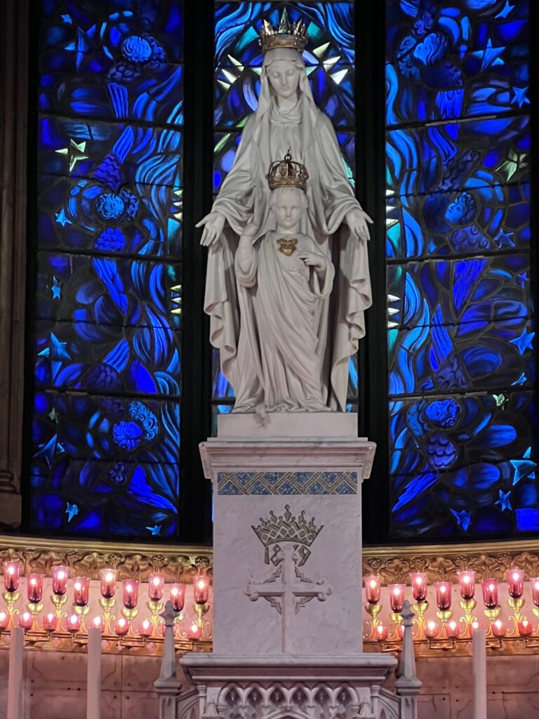 Bij binnenkomst sta ik versteld van de grootte van de basiliek. Wat een breed en hoog godshuis! De grote kapel van Onze-Lieve-Vrouw staat achter het altaar. Maria en haar Kind staan hoog en vele lichtjes maken van de ruimte een aards paradijs. Hier is het de plaats om te bidden, want zonder gebed tot Maria is het bezoek niet compleet. Hierna maak ik een ronde door de basiliek. Wat zijn hier veel glasramen met voorstellingen van onder andere Maria. De kleurrijke ramen zijn er in verschillende stijlen en de oudere voorstellingen staan mij meer aan.