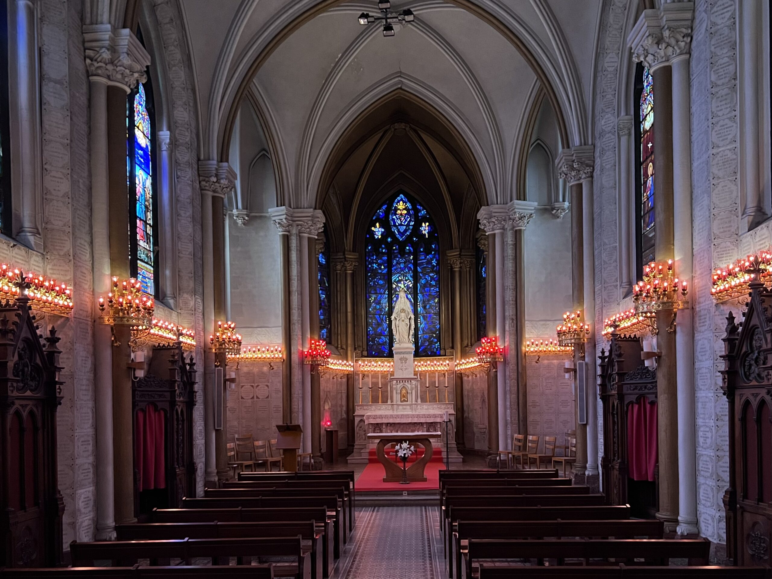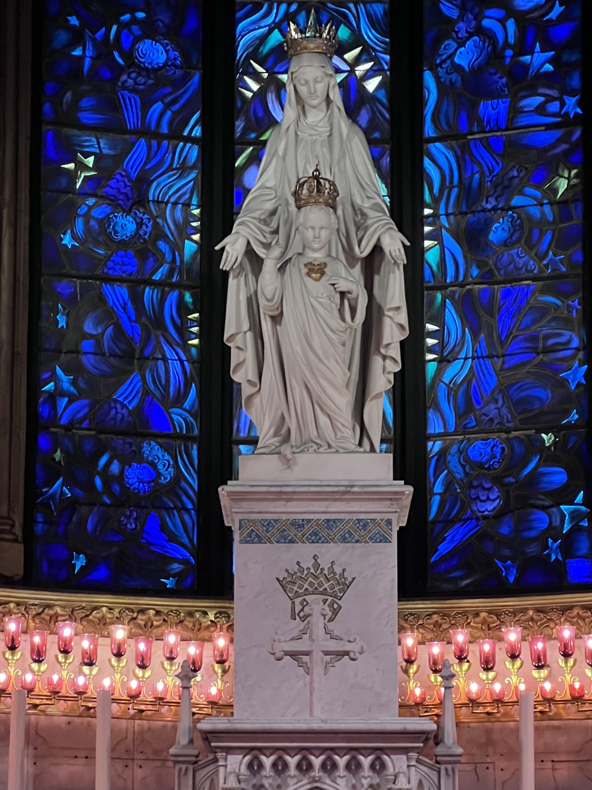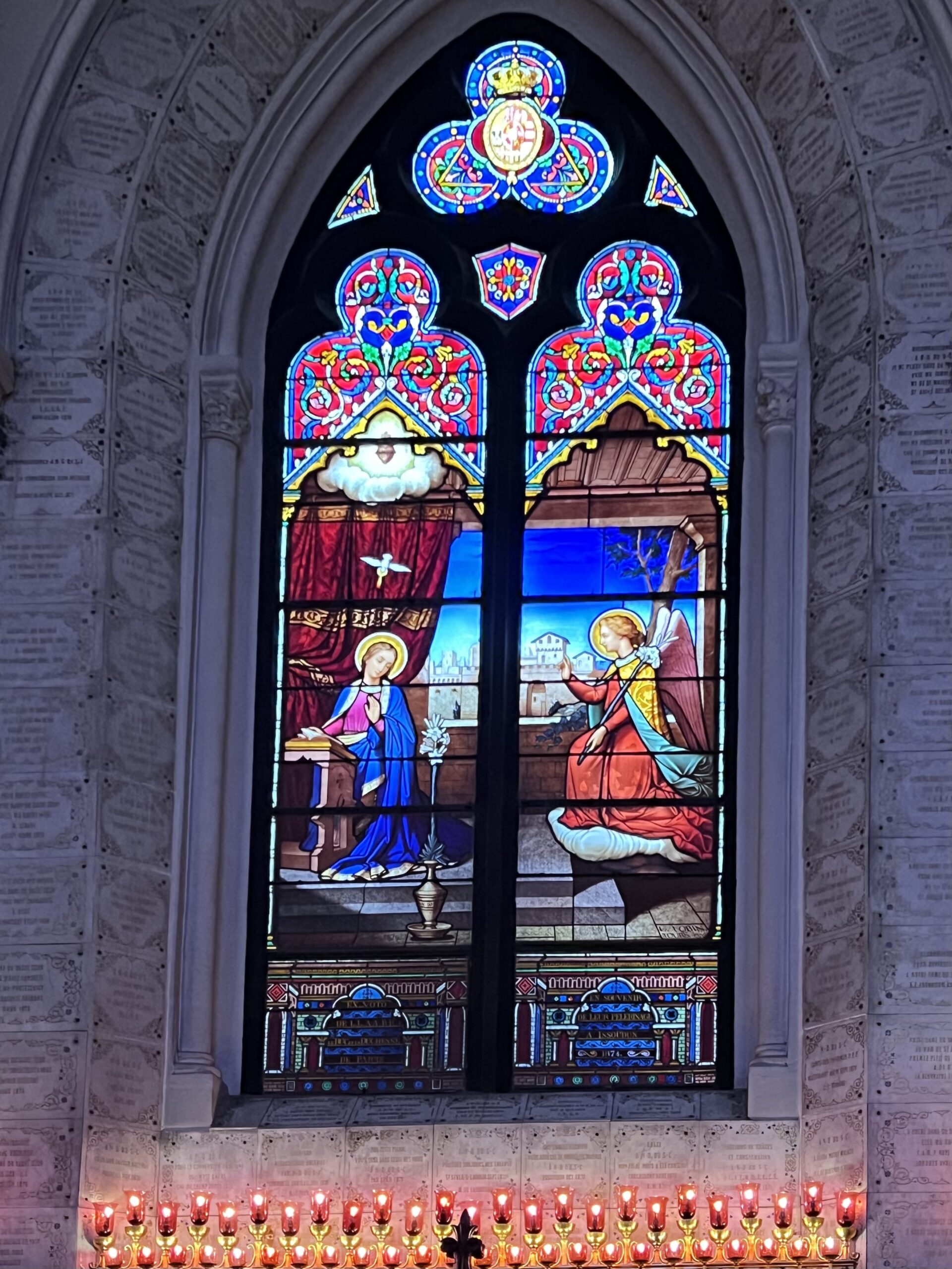 Bij binnenkomst sta ik versteld van de grootte van de basiliek. Wat een breed en hoog godshuis! De grote kapel van Onze-Lieve-Vrouw staat achter het altaar. Maria en haar Kind staan hoog en vele lichtjes maken van de ruimte een aards paradijs. Hier is het de plaats om te bidden, want zonder gebed tot Maria is het bezoek niet compleet. Hierna maak ik een ronde door de basiliek. Wat zijn hier veel glasramen met voorstellingen van onder andere Maria. De kleurrijke ramen zijn er in verschillende stijlen en de oudere voorstellingen staan mij meer aan.