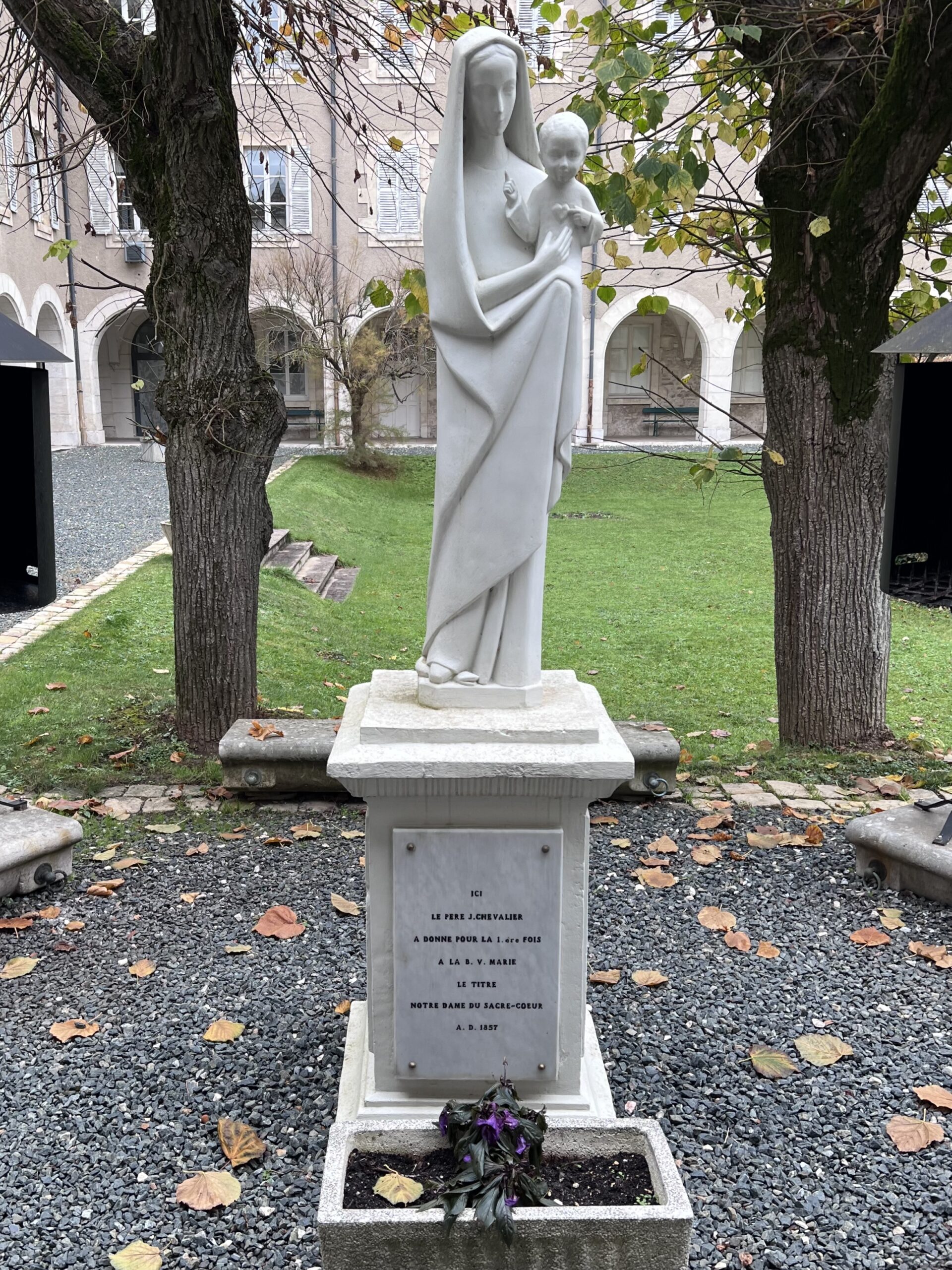 Vervolgens ga ik naar de overdekte gangen rond de tuin. Daar zie ik ook een beeltenis van Onze-Lieve-Vrouw op de plaats waar Maria is verschenen aan Jules Chevalier. Wat moet dat een aangrijpende gebeurtenis zijn geweest. Hij heeft Maria een contract voorgelegd. Heeft Zij nu echt getekend?