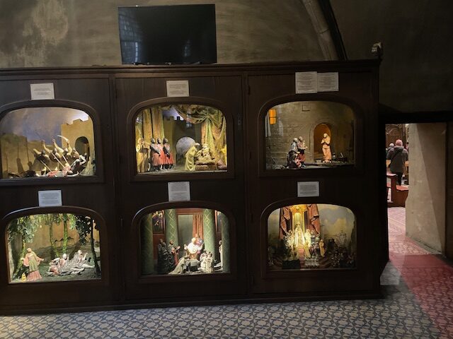 Naast het priesterkoor staat het diorama met vitrines met de geschiedenis van dit mariale oord. Ik zie poppen die het verleden typeren, zoals de drie broers en Ismeria, de dochter van de sultan van Caïro. Deze vrouw heeft het leven gered van de drie ridders van Eppes, die deelnemen aan de kruistochten en gevangen worden genomen. Ismeria bekeert zich tot het christendom en hier heeft Maria een belangrijke rol vervuld.