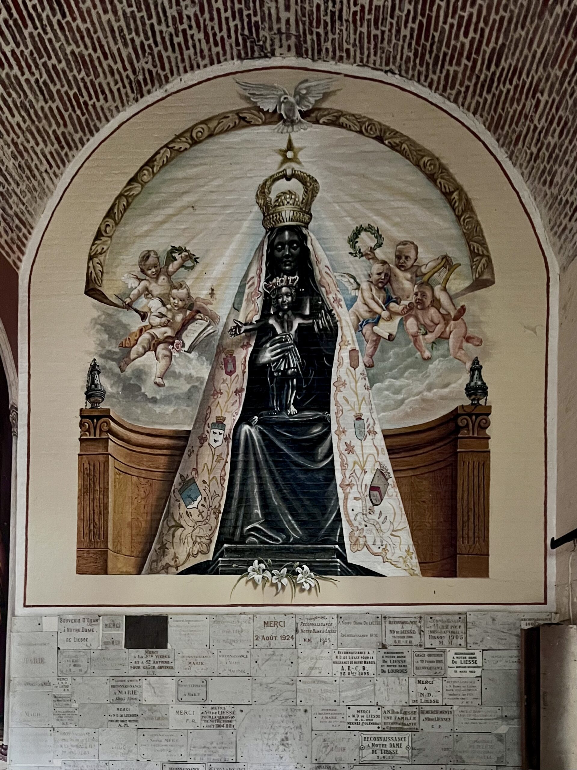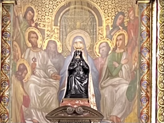 Daarna ga ik naar het genadebeeld. De Zwarte Madonna! Wat heeft U veel meegemaakt, komt in me op.Lang sta ik bij het genadebeeld en daarna is het de glas-in-loodramen, fresco’s en schilderijen bewonderen.