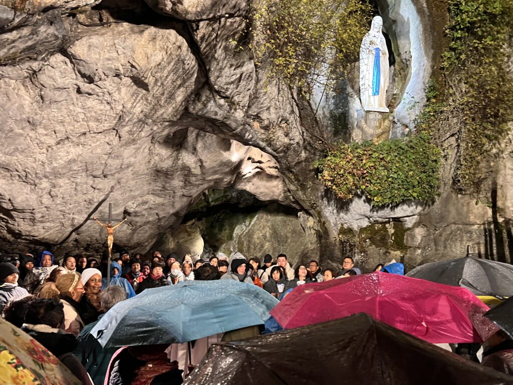 In de tweede helft van november 2025 bezoek ik weer het Heiligdom van Lourdes. Het drukke bedevaartseizoen is voorbij en in de avond wordt een rozenkransgebed bij de Grot gehouden in plaats van de processie met kaarsen. In de aankondiging staat dat de biddende samenkomst met fakkels gebeurd, maar deze lichtgevers heb ik niet gezien. Wellicht komt dat door de regen die al uren de bezoekers nat maakt. Een paar honderd pelgrims staan in en bij de grot te bidden. Dit is wel een speciale gebeurtenis.