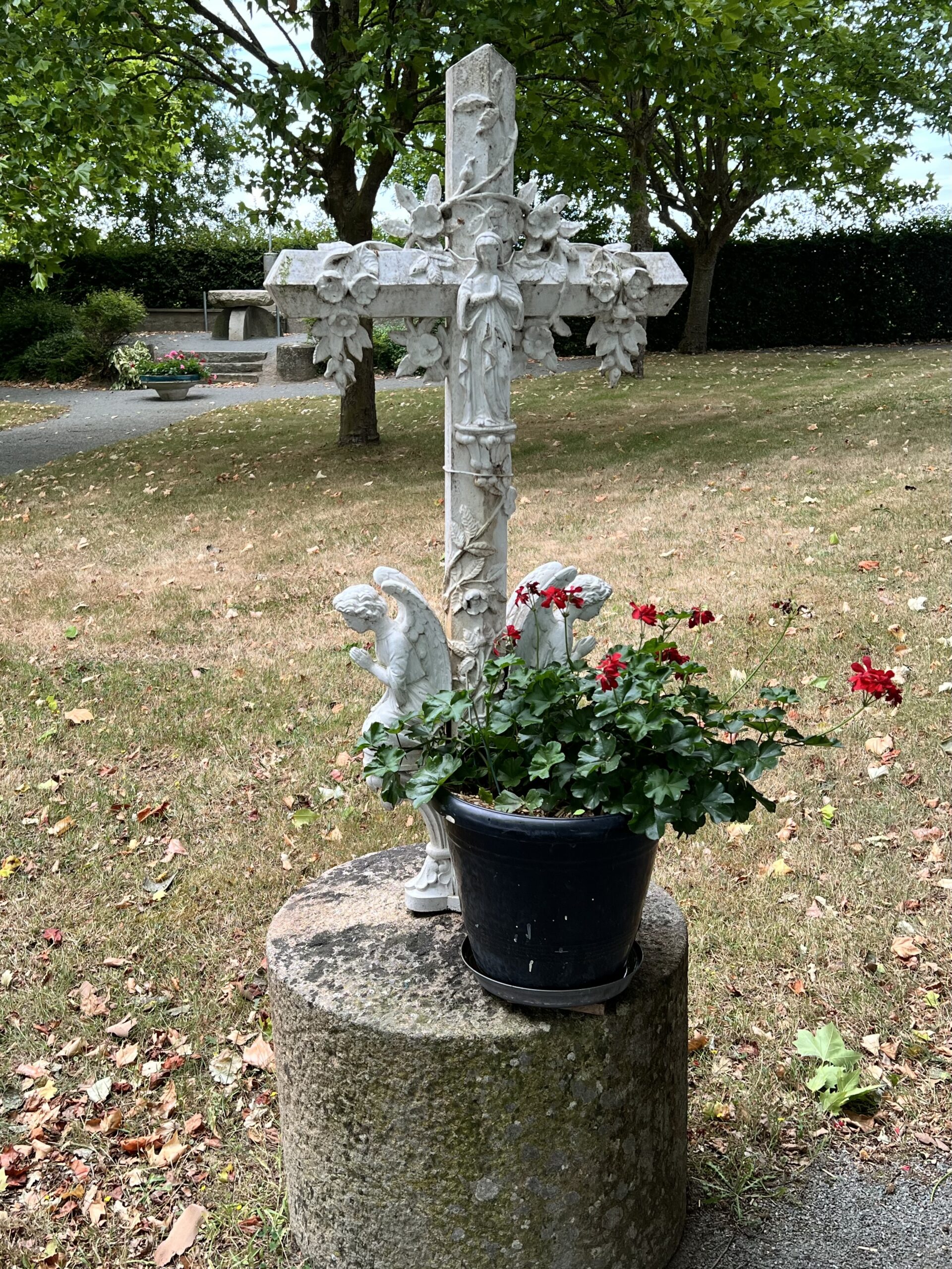 kruis met Maria-afbeelding op de esplanade van “Saint-Laurent-de-la-Plaine”