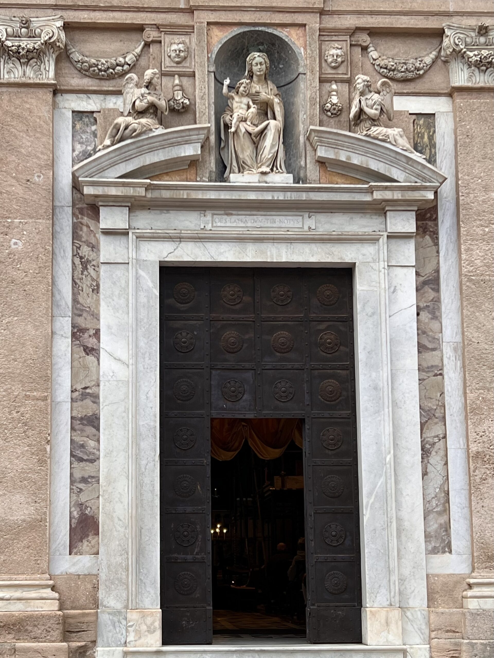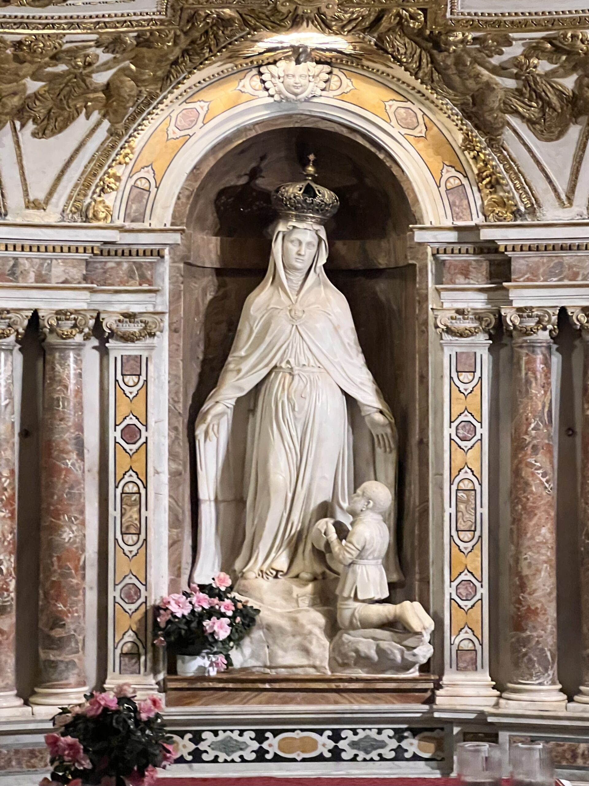 In de kerk is een viering bezig. Maria van dichtbij begroeten is er dan ook nu nog niet bij. Tussen kerkgangers neem ik plaats, want de mensen zitten dicht bijeen, omdat er restauratiewerken plaatsvinden, is er minder zitgelegenheid. Het is wachten en bidden tot Onze-Lieve-Vrouw met vrienden in gedachten. Een half uur later is het tijd voor een hostie. Na de communie-uitreiking is de eucharistieviering snel gedaan. Vervolgens maak ik een rondgang door de kerk, sta stil bij schilderingen en beelden. Dan groet ik Maria. Kijk Haar aan, dank voor de voorspoedig verlopen reis en maak mijn plan voor vandaag aan Haar bekend. Dit laatste is onnodig, want Zij weet wel wat ik hier doe.