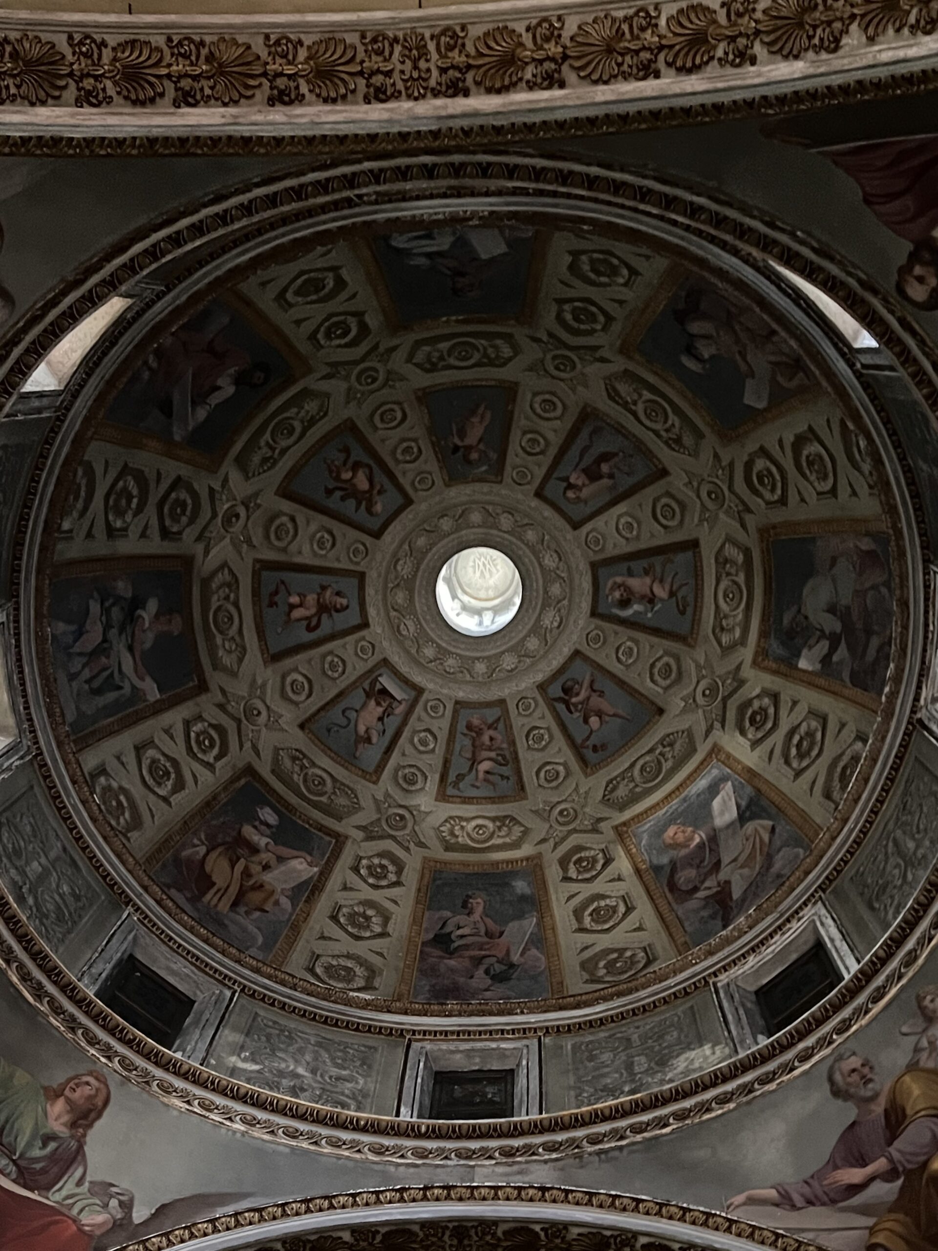 De koepel toont fresco’s en deze zijn geschilderd door kunstenaar Bernardo Castello (1557-1629).