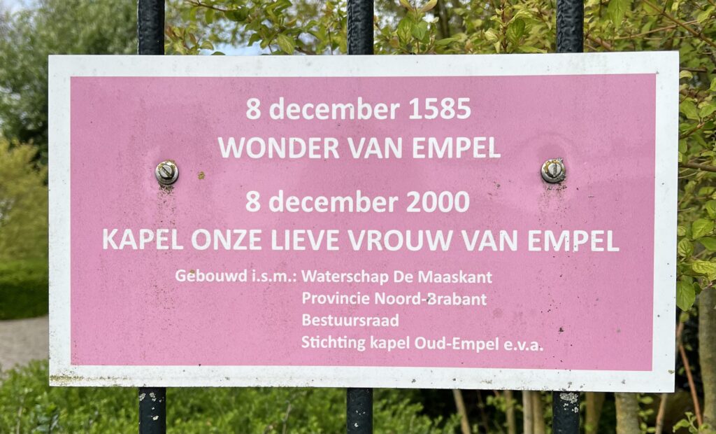 In en rond Empel heeft een hevige strijd gewoed in de Tachtigjarige Oorlog. In de parochiekerk van Empel wordt dit verbeeld. Schilderingen in de parochiekerk brengen me naar de strijd en naar het wonder in 1585. De katholieke, ervaren Spanjaarden zijn in oorlog met de protestantse, Staatse troepen. Ik verneem dat de Hollandse strijders dijken hebben doorgestoken, waardoor de Spaanse militairen niet kunnen ontsnappen. De Spanjaarden zijn omsingeld door Hollandse, protestante troepen en kunnen geen kant uit. Maar Maria gaat de katholieke Spanjaarden redden. Dit is het wonder van Empel tijdens de Slag bij Empel.