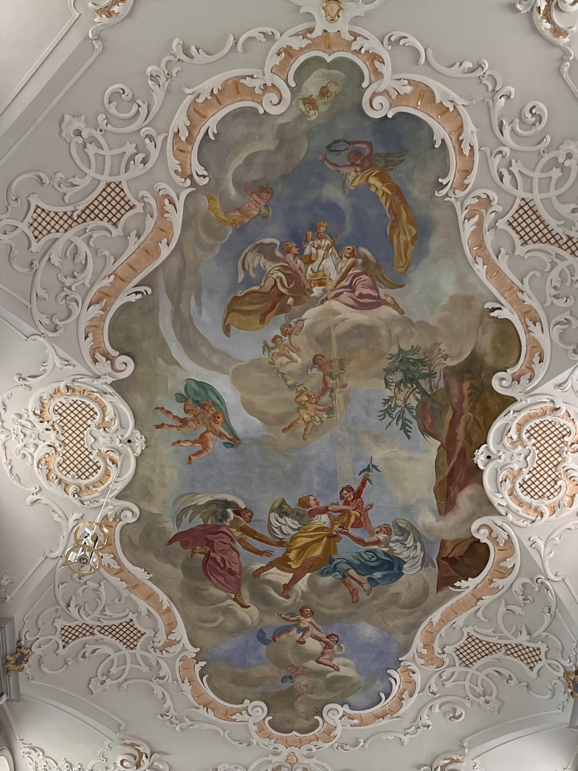 Bij het naar boven kijken, is het een groot plafond zien dat vol schilderingen is versierd. Maria wordt door vele engelen omringd.