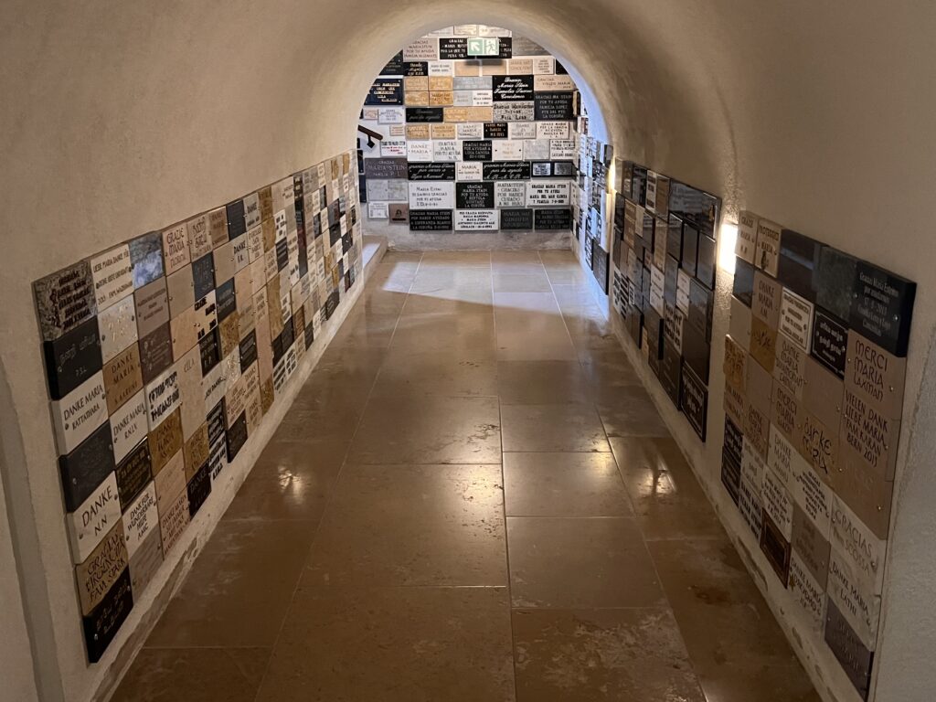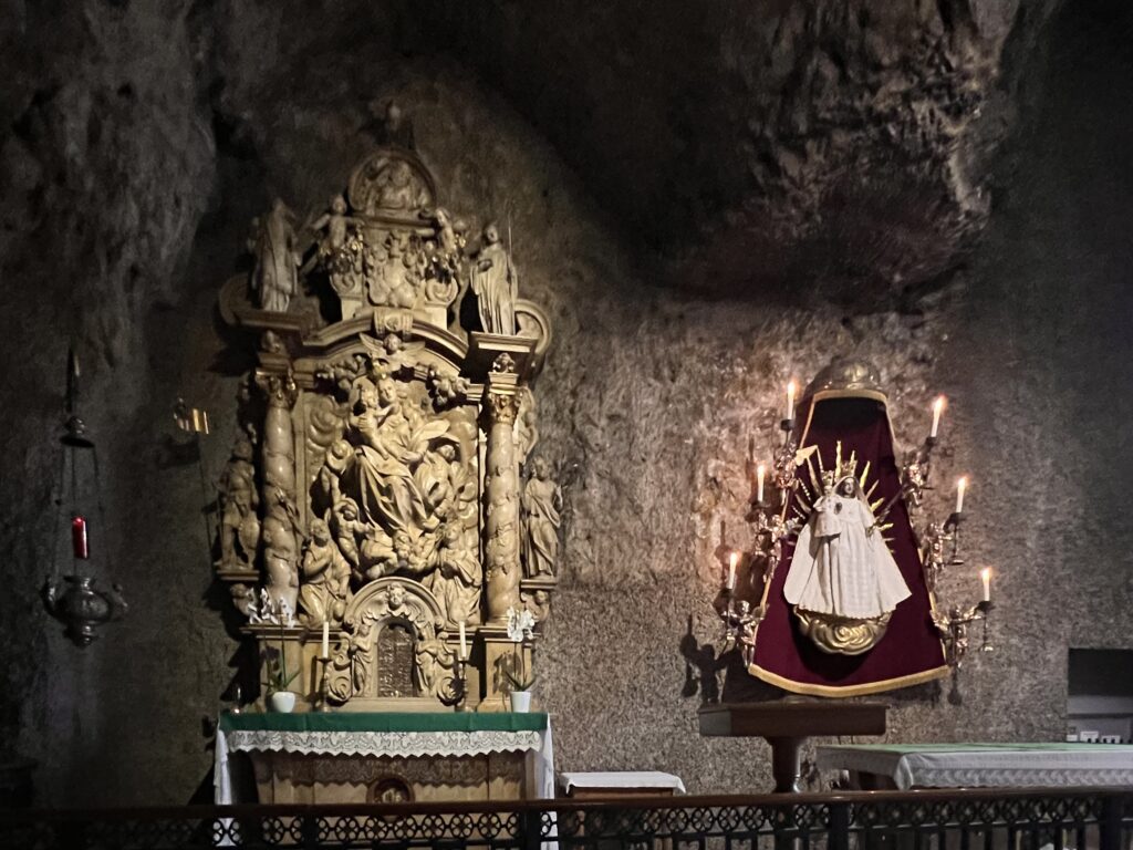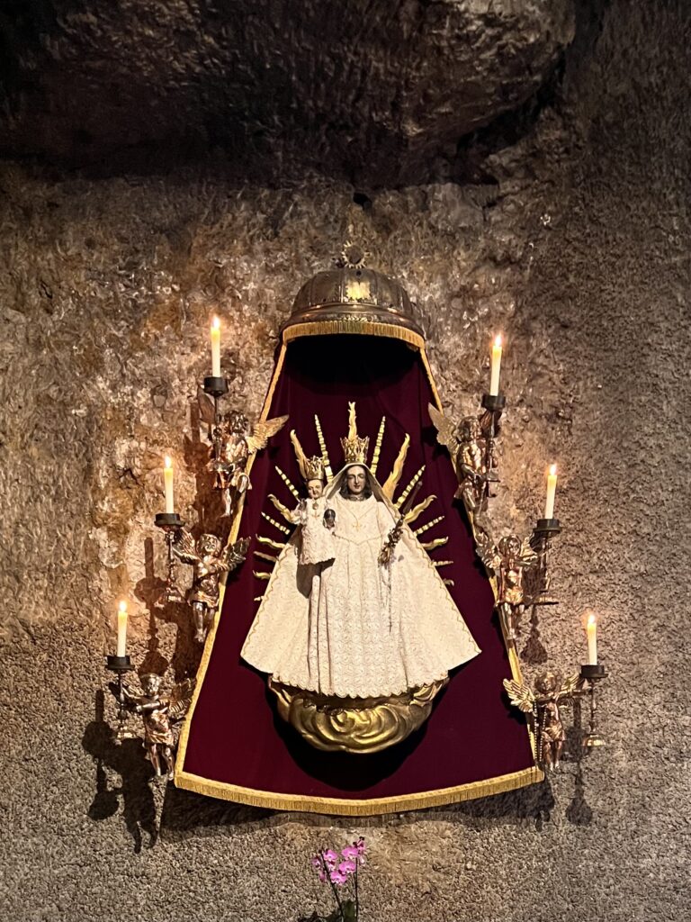 Dan ga ik naar de grot en de weg erheen is een aflopende gang met vele ex voto’s, enkele bochten en vervolgens zo’n 60 treden om in een bijzonder mooie ruimte te komen. Hier wordt de gotische beeltenis van Maria vereerd in een ondergrondse devotiekapel die onder basiliek en klooster ligt. De oorsprong van het beeld is onbekend. Ik zie Maria als “de Moeder van troost”, die hier ontelbare pelgrims heeft ontmoet. In deze rotsgrot verblijven, geeft een heel apart gevoel. Dit is een unieke ervaring mogen opdoen. Om de indrukken in me op te nemen, neem ik plaats. De twee gebeurtenissen van de rots te vallen en dit overleven komen in me op, evenals de vele stormen die het heiligdom heeft weten te doorstaan. Dan wordt het tijd voor gebed tot Onze-Lieve-Vrouw en komen vrienden en goede kennissen in me op.