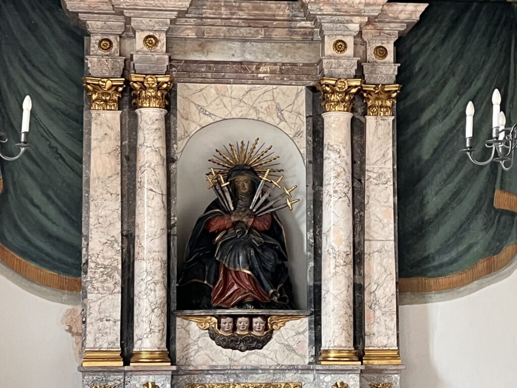 Een kapel is toegewijd aan de Moeder der Smarten en Maria is daarbij met zwaarden in haar borst afgebeeld.