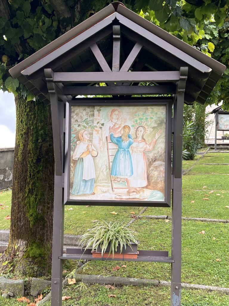Bij aankomst in de plaats zet ik de auto in de straat van de basiliek en ga vervolgens naar het heiligdom dat op een verhoging ligt. Aan weerszijden van de opgang zie ik afbeeldingen van de geschiedenis van dit mariale oord en daarna is het de basiliek ingaan.
