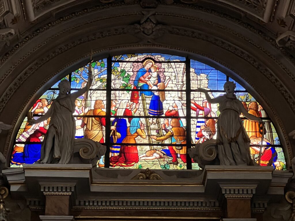 glas-in-loodraam van de verschijning in de bedevaartkerk van Morbio Inferiore