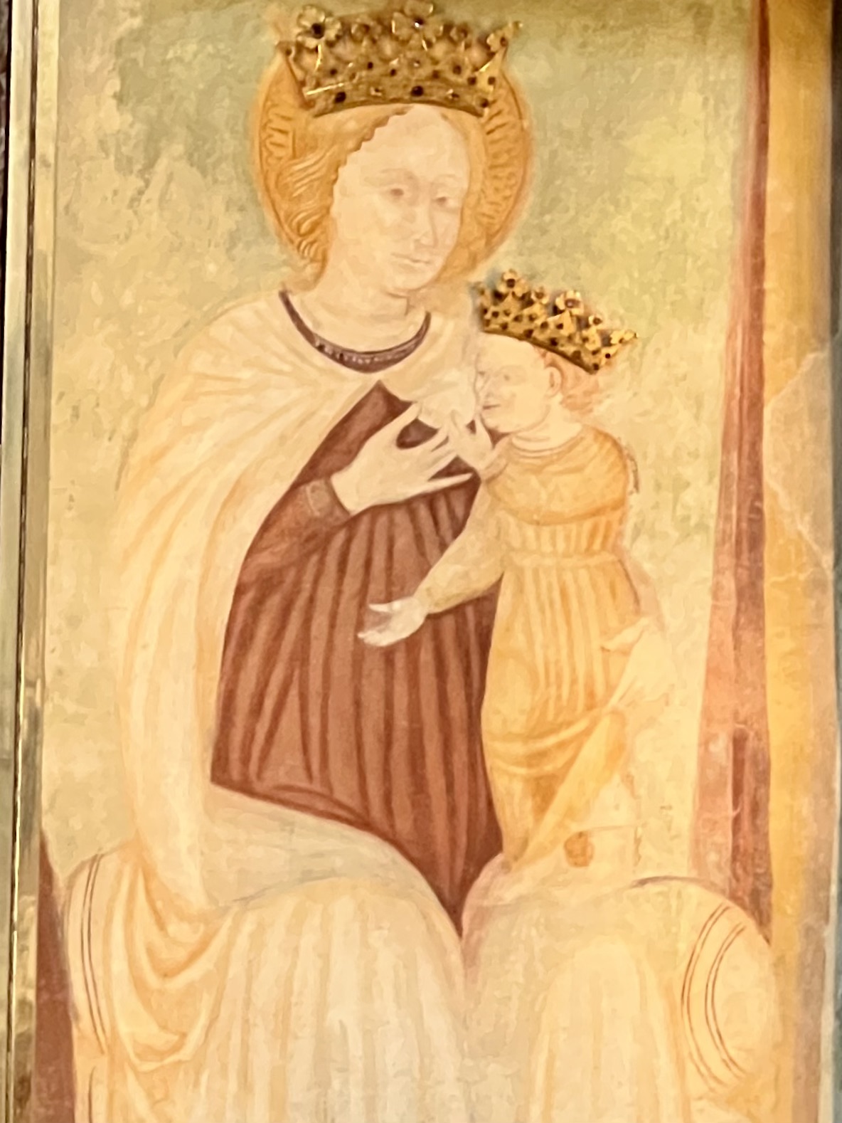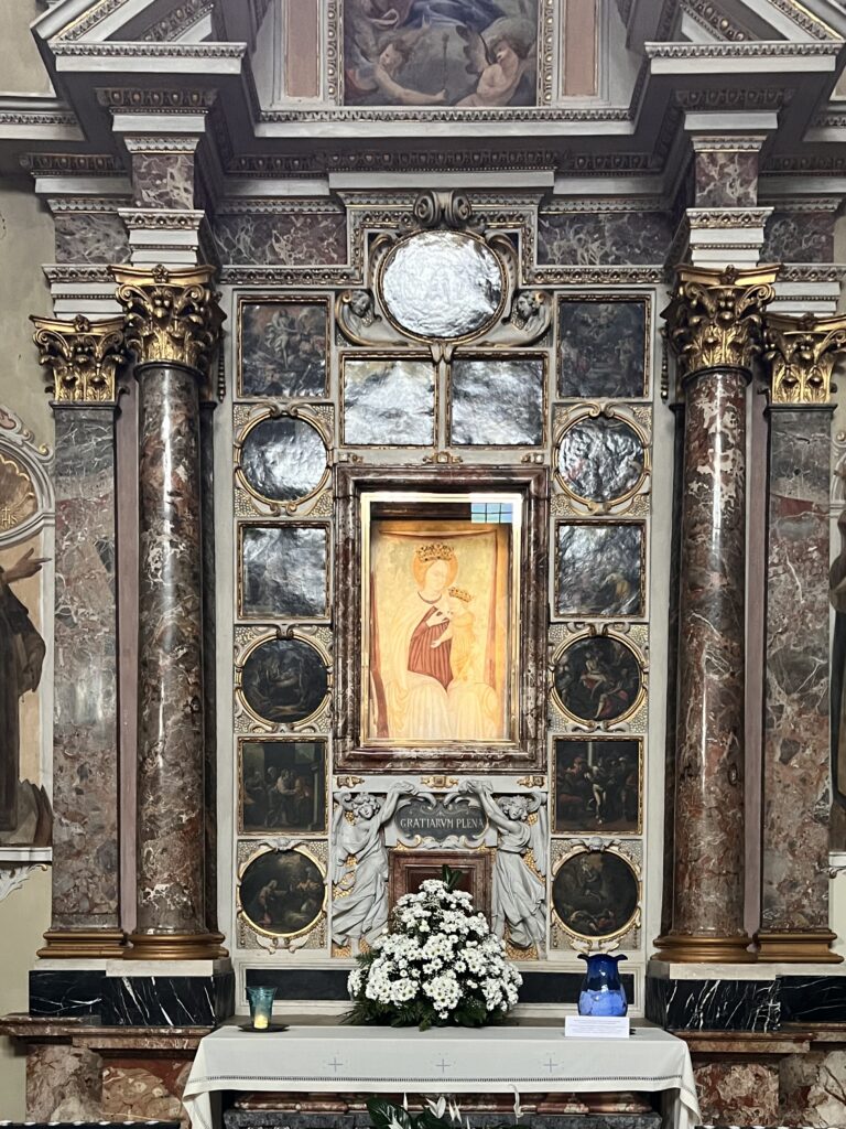 Bij binnenkomst word ik meteen geraakt door de schoonheid van het interieur. Wat een schilderijen, ex voto’s, beelden en fresco’s in dit gebouw! Ik maak een rondgang en blijf langdurig bij het genadebeeld staan. Maria en Kind zijn gekroond en hun handen reiken naar elkaar. Dit wel een bijzondere voorstelling van Onze-Lieve-Vrouw en haar Zoontje.