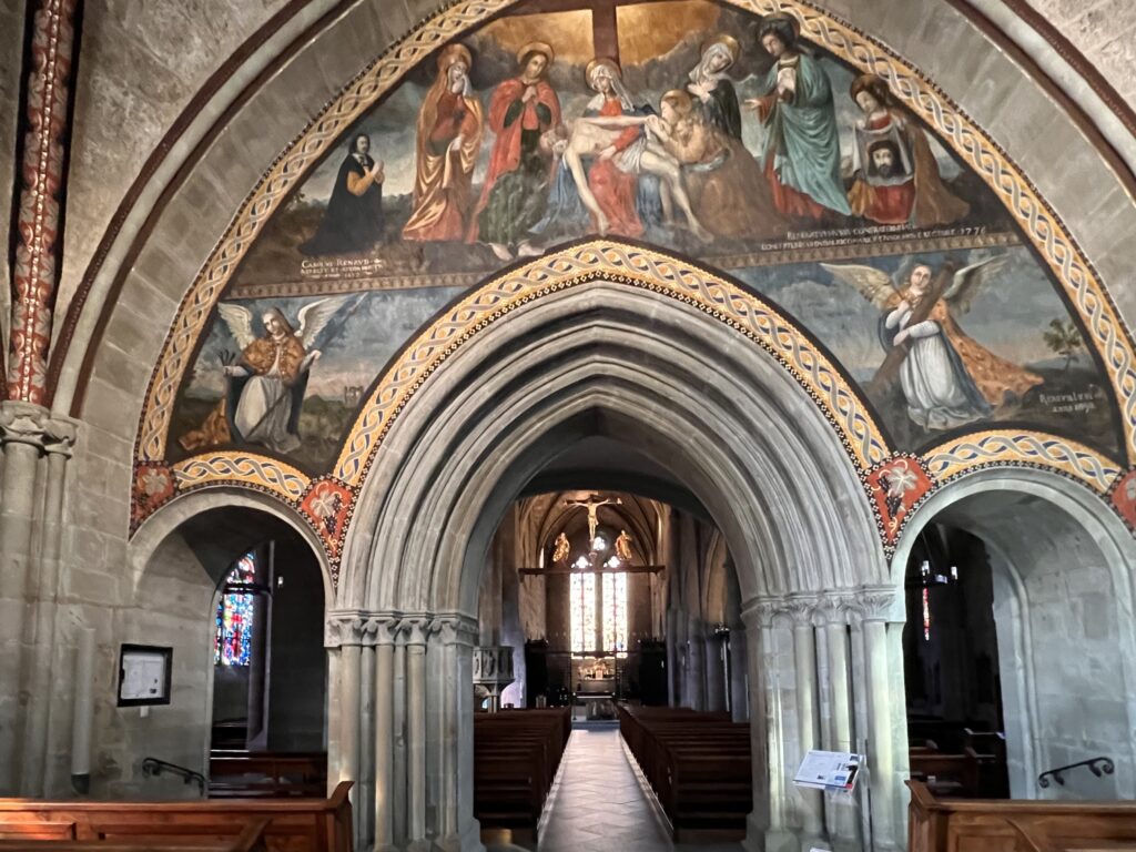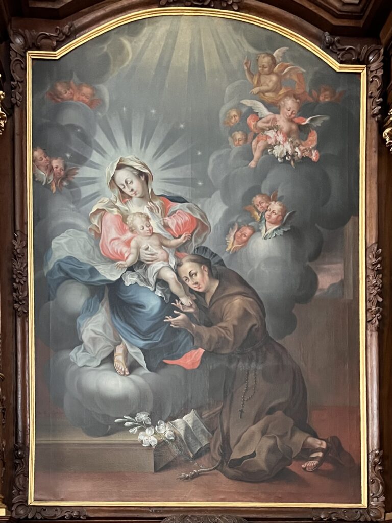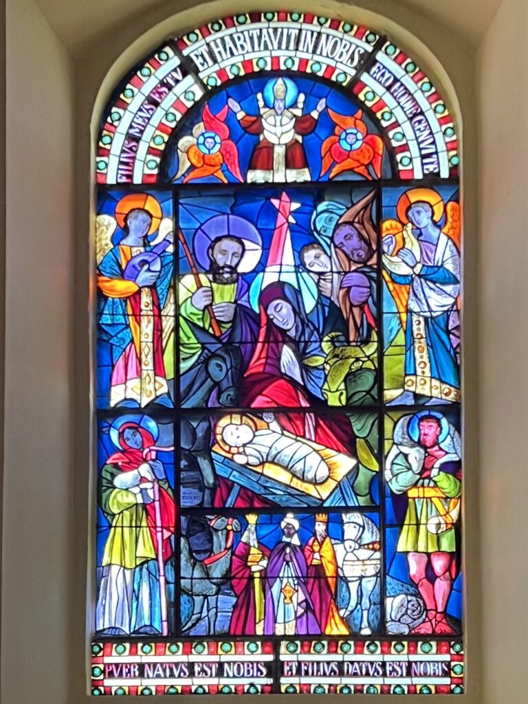 Hierna ga ik naar het nabijgelegen Siviriez en bezoek de kerk, waar ook afbeeldingen van haar zijn te zien. Er is een zij-altaar voor Marguerite Bays ingericht met een reliekschrijn van haar. In de kerk neem ik plaats en vraag me af of er velen zijn zoals zij. Voor mij is het antwoord: heel weinig. In de kerk zijn mooie, kleurrijke glas-in-loodramen met daarbij Latijnse teksten. Op een van de ramen staat een tekst en in het Nederlands betekent het: “Jij bent mijn Zoon, Ik ben vandaag geboren en Hij heeft onder ons gewoond. Een Kind is ons geboren en een Zoon is ons gegeven.”