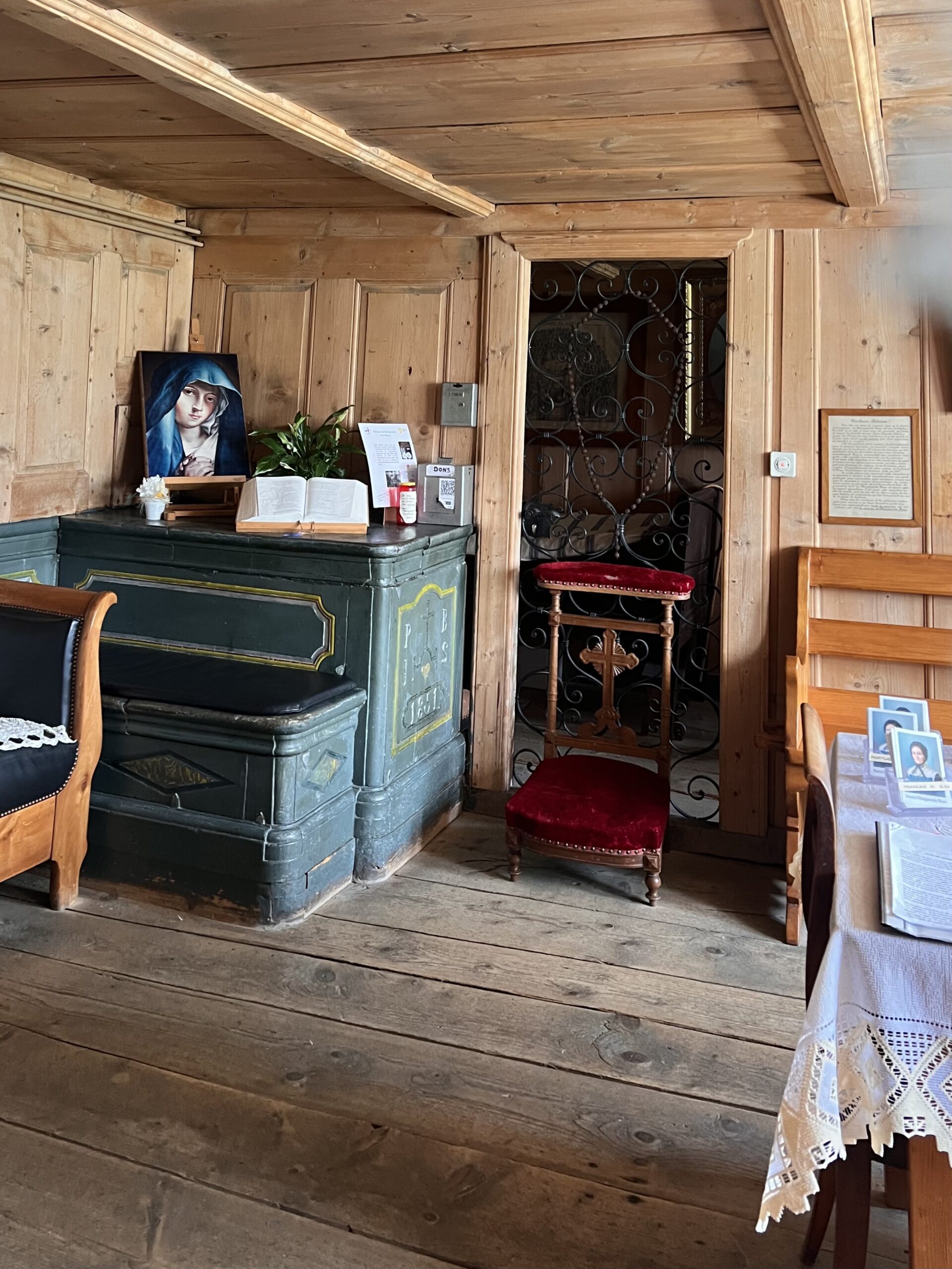 In het gehucht La Pierraz, dat ook wordt geschreven als La Pierra, breng ik een bezoek aan het woonhuis van Marguerite Bays. Het te bezoeken huis is de boerderij waar zij is geboren. Hier heeft zij gebeden, geslapen en gewerkt. Enkele kamers zijn toegankelijk voor bezoekers en bij de ruimten, waarvan de deur is gesloten, kan ik naar binnen kijken. Wel nieuwsgierig, komt in me op. Het leven van Marguerite komt met flarden in me op. Wat is dit een bijzonder vrouw! Wat heeft zij veel doorstaan! Wat is zij een voorbeeldig mens voor anderen. Zo sociaal, gedreven, dienstbaar en godvruchtig. Mocht ik een hoed op hebben, dan zou ik deze nu voor haar afnemen. Respect betuigen, heet dat. In de kamer aan de straatzijde kan ik naar binnen en ga zitten. Laat me enkele gebeurtenissen uit haar leven in gedachten beleven en dan bid ik voor haar. Een voorbeeld voor velen, is zij zeker.