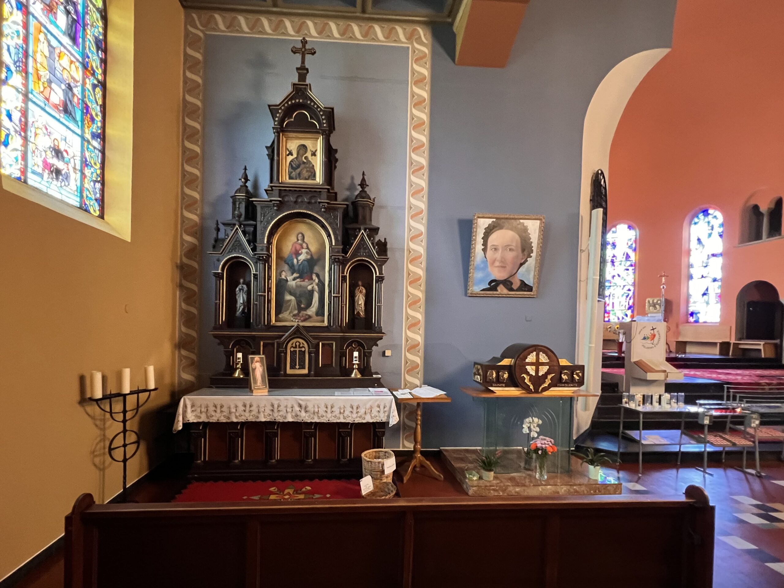 Hierna ga ik naar het nabijgelegen Siviriez en bezoek de kerk, waar ook afbeeldingen van haar zijn te zien. Er is een zij-altaar voor Marguerite Bays ingericht met een reliekschrijn van haar. In de kerk neem ik plaats en vraag me af of er velen zijn zoals zij. Voor mij is het antwoord: heel weinig. In de kerk zijn mooie, kleurrijke glas-in-loodramen met daarbij Latijnse teksten. Op een van de ramen staat een tekst en in het Nederlands betekent het: “Jij bent mijn Zoon, Ik ben vandaag geboren en Hij heeft onder ons gewoond. Een Kind is ons geboren en een Zoon is ons gegeven.”