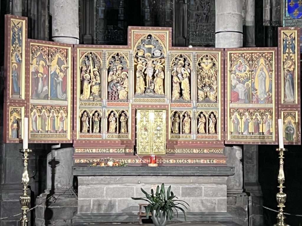 Het retabel van het hoogaltaar is uit de 2e helft van de 19e eeuw. Het ontwerp is van architect en pionier van de neogotiek in België, Jean-Baptiste Charles François (Jean) Béthune (1821-1894). De gebeeldhouwde onderdelen zijn afkomstig van het atelier Bressers-Blanchaert te Gent. De doeken zijn gemaakt door de Luikse kunstschilder Jules-Chrétien Charles Joseph-Henri (Jules) Helbig (1821-1906). Hier zijn fasen uit het leven van Maria verbeeld.