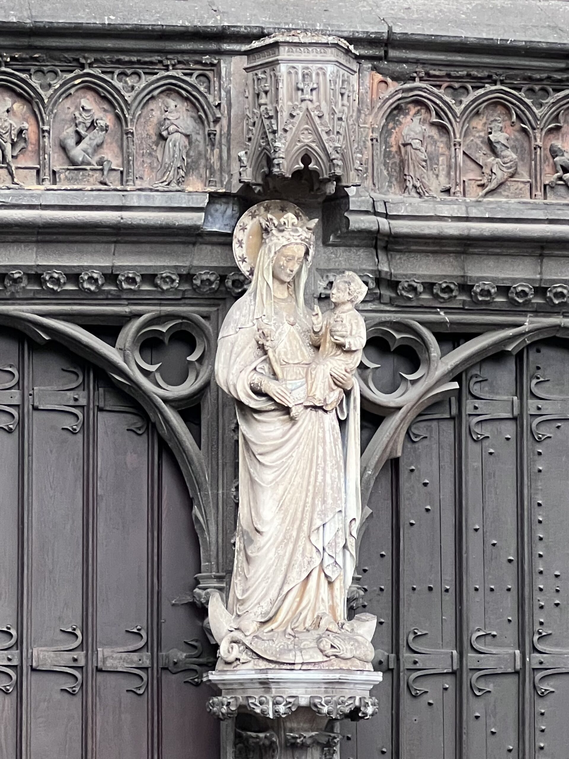 In het noordelijk portaal is het laatste overblijfsel van de kerk uit de 12e eeuw. Hier is het restant van een verweerde beeltenis van Maria met haar kind op schoot.