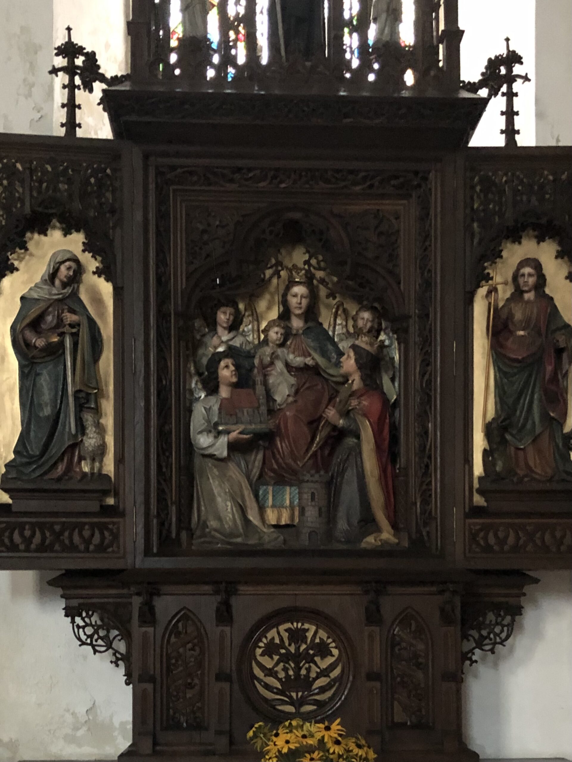 In de Schatkamer staat ook een groot, oud, houten, Mariabeeld. Deze beeltenis heeft geschiedenis gemaakt door miljoenen bezoekers te verwelkomen. Wat zouden de pelgrims tegen Haar hebben gezegd? Het grote beeld is gemaakt rond 1360. Maria zit met haar Kind op een troon en is uitgebeeld met kroon en scepter. Voor het in de schatkamer is geplaatst, heeft het beeld gestaan in de sacramentskapel. Het beeld kan afkomstig zijn uit het voormalige kartuizerklooster in Gaming en heeft daardoor de naam “Kartause Maria Thron”.