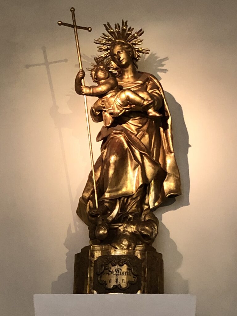 Op een zondag ben ik tegen 8.00 u in de ochtend in de basiliek en woon de eucharistieviering bij. Vervolgens is het een rondgang maken in het prachtige gebouw. Hierbij kom ik Maria veelvuldig tegen op schilderijen en als beeltenissen. Wat is het hier mooi! Ik raak nog meer onder de indruk als ik vlakbij het genadebeeld ben. Voor deze beeltenis komen de pelgrims naar Mariazell.