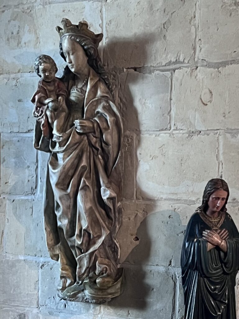 Tegen een muur is geplaatst een stenen beeltenis van Maria met Kind.