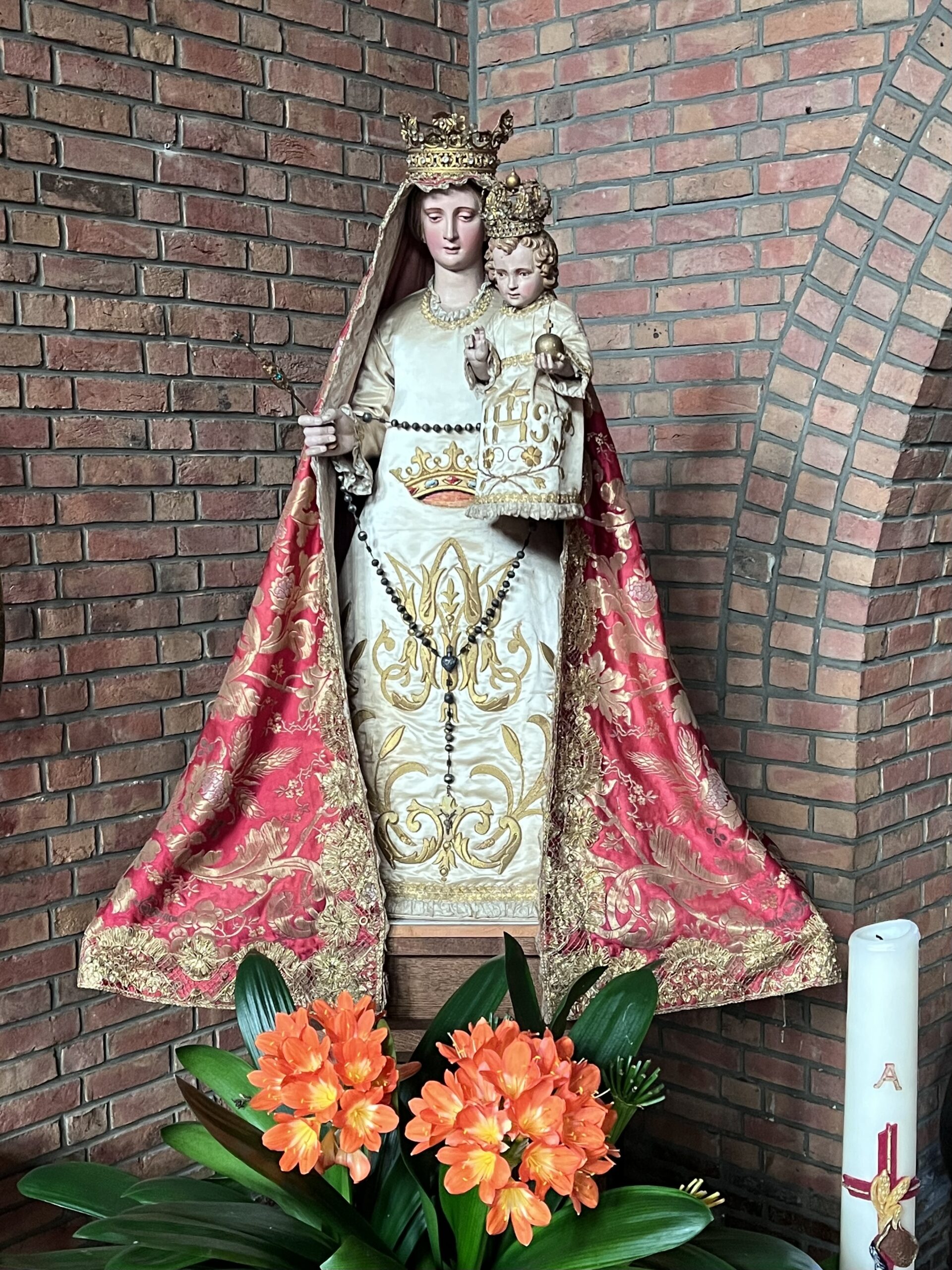 Een andere beeltenis van Maria met Kind toont de Moeder Gods staande met haar Kindje op de linkerarm, in de rechterhand een scepter, grote rozenkrans om beide armen, beiden gekroond en statige kleding met mantel aan.